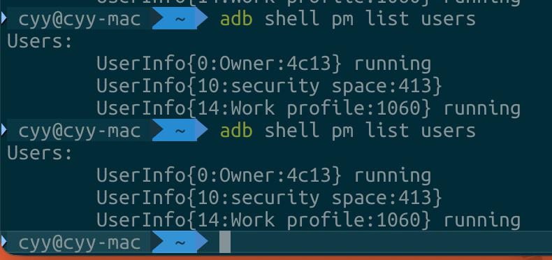 发现,在创建刚点击下去后,迅速观测 adb shell pm list users,就可以看到 Island 创建出了 Work Profile。