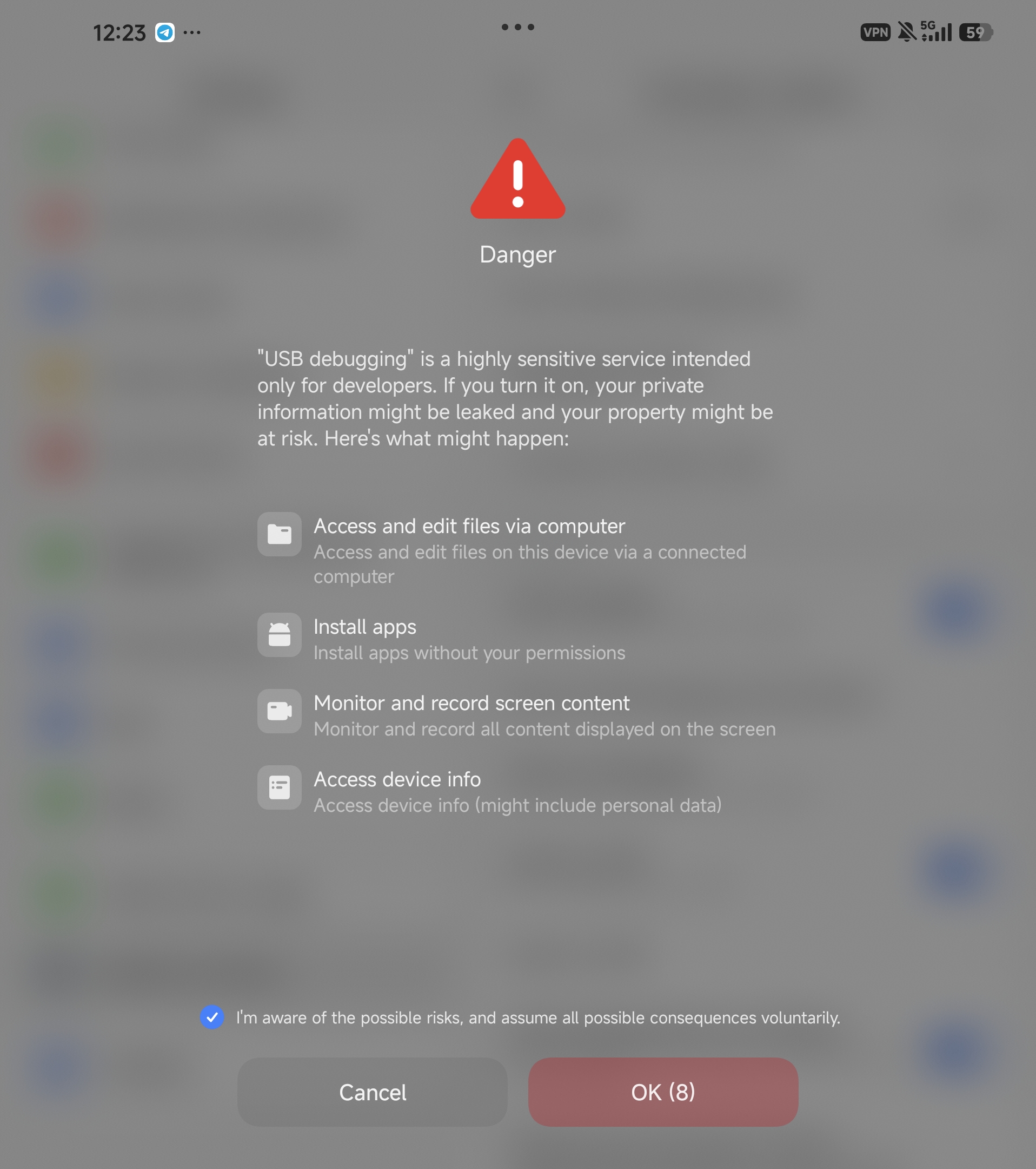 我朋友和我也与 AI 聊了这个问题,寻求解决方案,但是 AI 也同样给出了判死刑的回答,认为不太可能在几秒钟的时间内操作手机打开 ADB,如果售后没有后门几乎无解。我一开始也认为就算有 OTG 模拟 HID 希望也不大,直到我在自己手机上测试发现 只需要 1s 左右时间即可打开 ADB ,才重新燃起了巨大的希望。